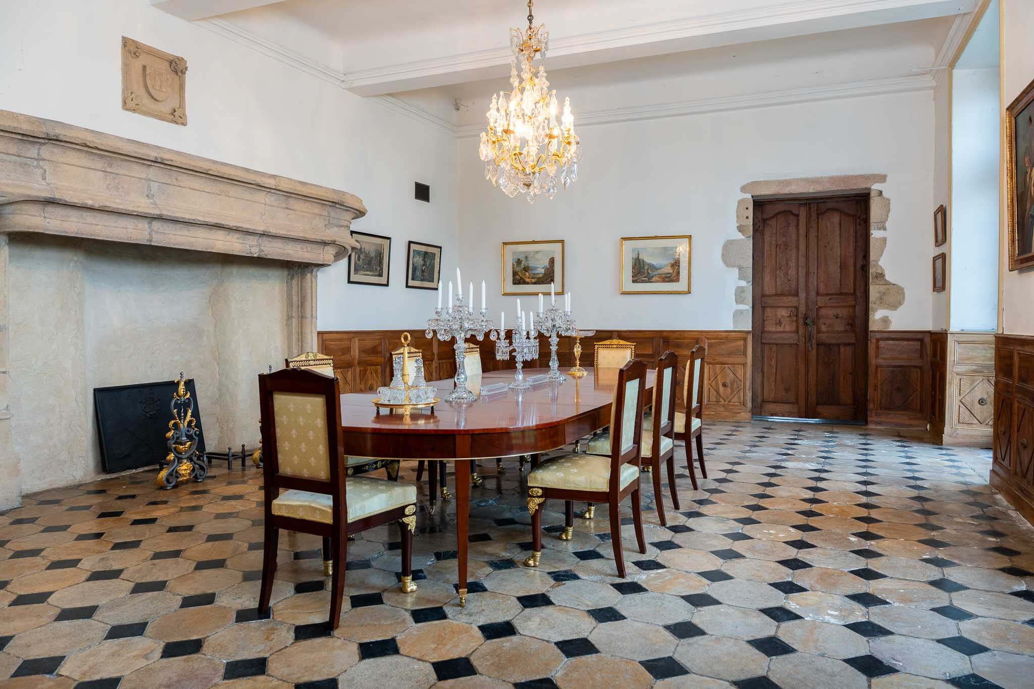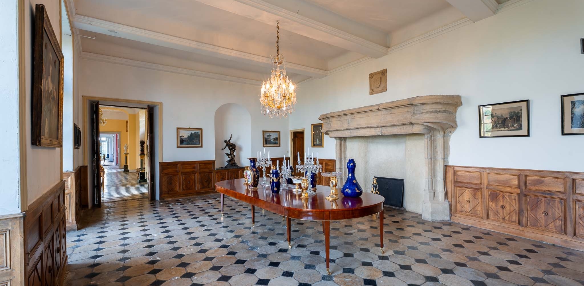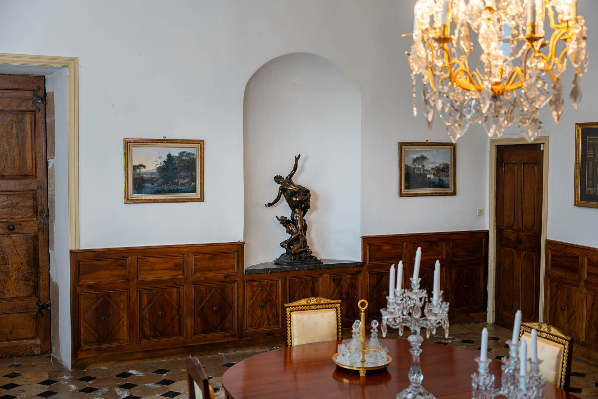 La sala da pranzo del castello conserva tracce del Rinascimento. Abbiamo deciso di decorarla con un magnifico tavolo da pranzo . E abbiamo impreziosito questa magnifica alcova con una monumentale scultura in bronzo, " Il Ratto delle Sabine ".