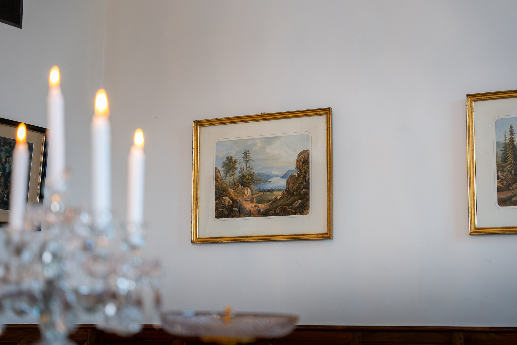 Le pareti della sala da pranzo sono decorate con numerosi dipinti, tra cui questa coppia di acquerelli di François-Jules Collignon.