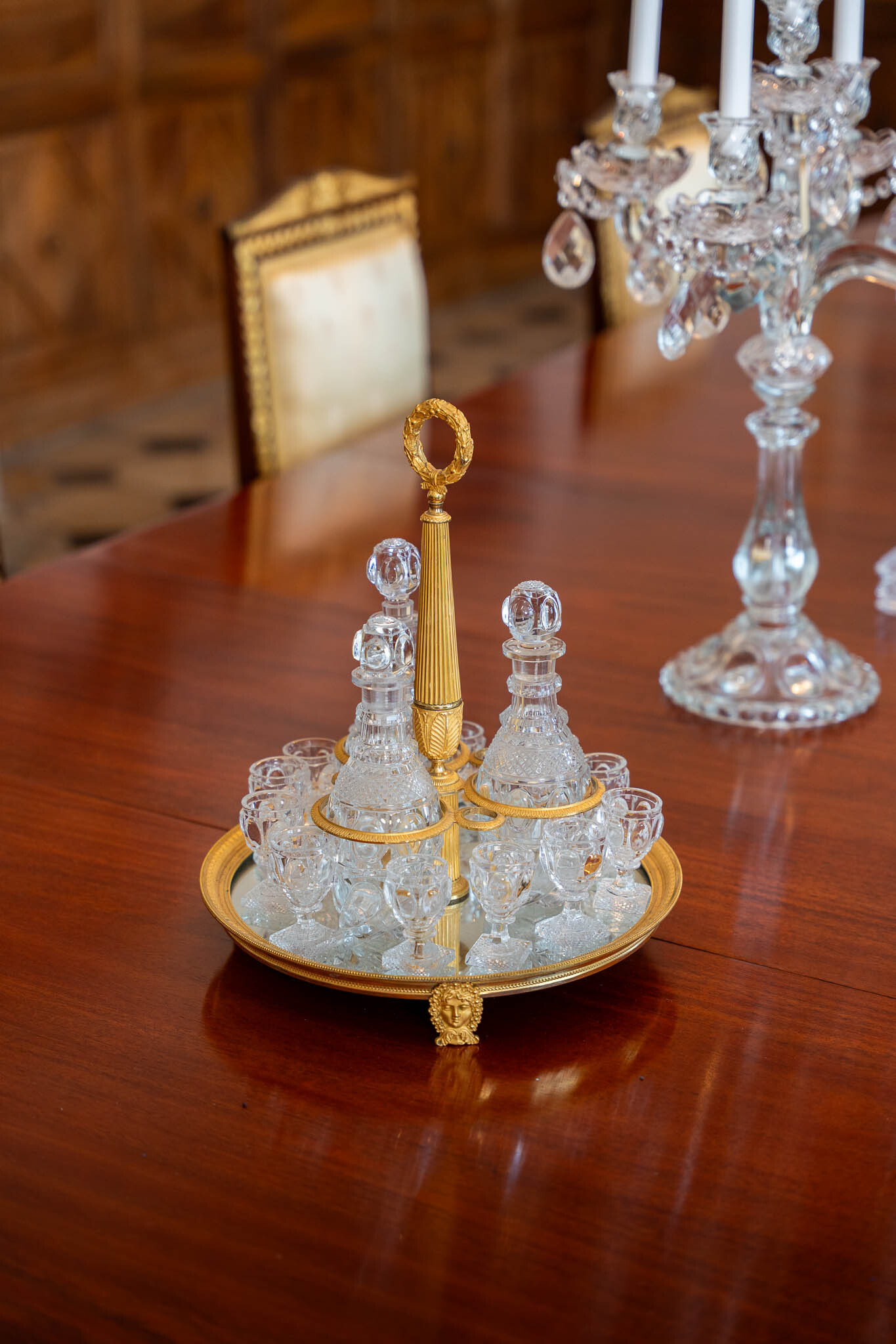 Il tavolo è decorato con diversi pezzi, tra cui questo servizio da liquore in bronzo dorato e cristallo tagliato in stile Carlo X, che impreziosisce perfettamente il nostro tavolo da pranzo in stile Direttorio.